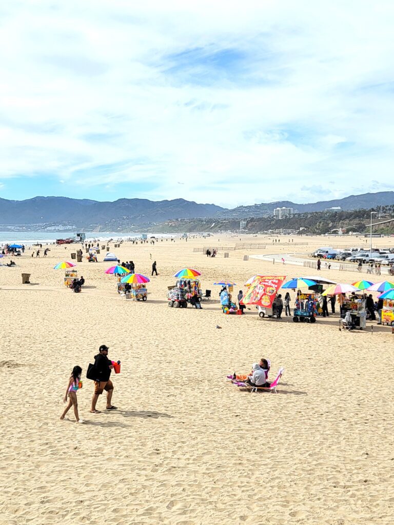 To be completely transparent, we werenโt so impressed by the Santa Monica beach itself. We are beach lovers and have seen plenty of better beaches, so we werenโt exactly compelled to walk along the sand or dip our toes in the water. But on the whole, the Santa Monica pier experience was worth the trip.