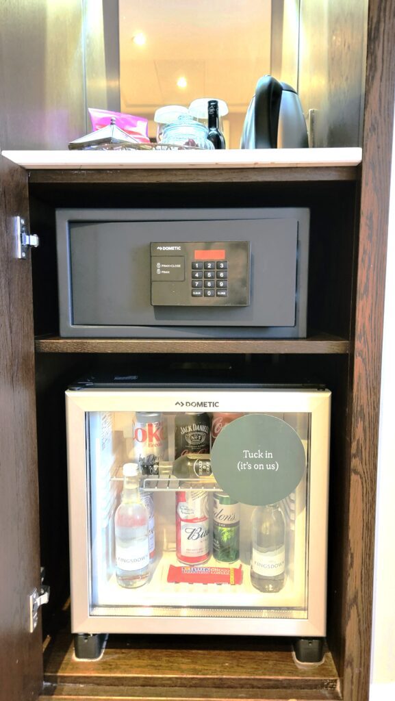 First, the full in-room mini bar that was restocked daily for free (!) was beyond what we’ve come to expect. And the availability of room service, an onsite gym, and laundry and dry cleaning services are those special touches that make a hotel extra comfortable.